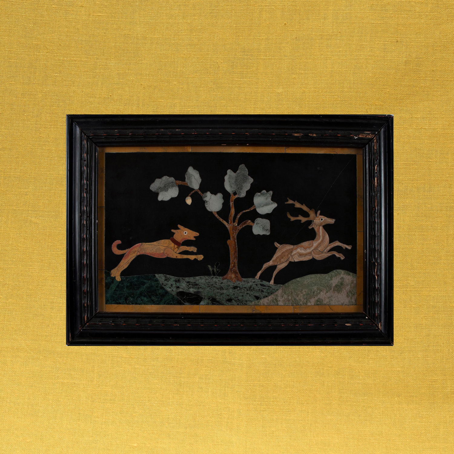 La scena raffigura un cane che insegue un cervo, manifattura delle Botteghe Granducali Fiorentine Dimensioni int. 35×50, int. 25,5×41 cm.