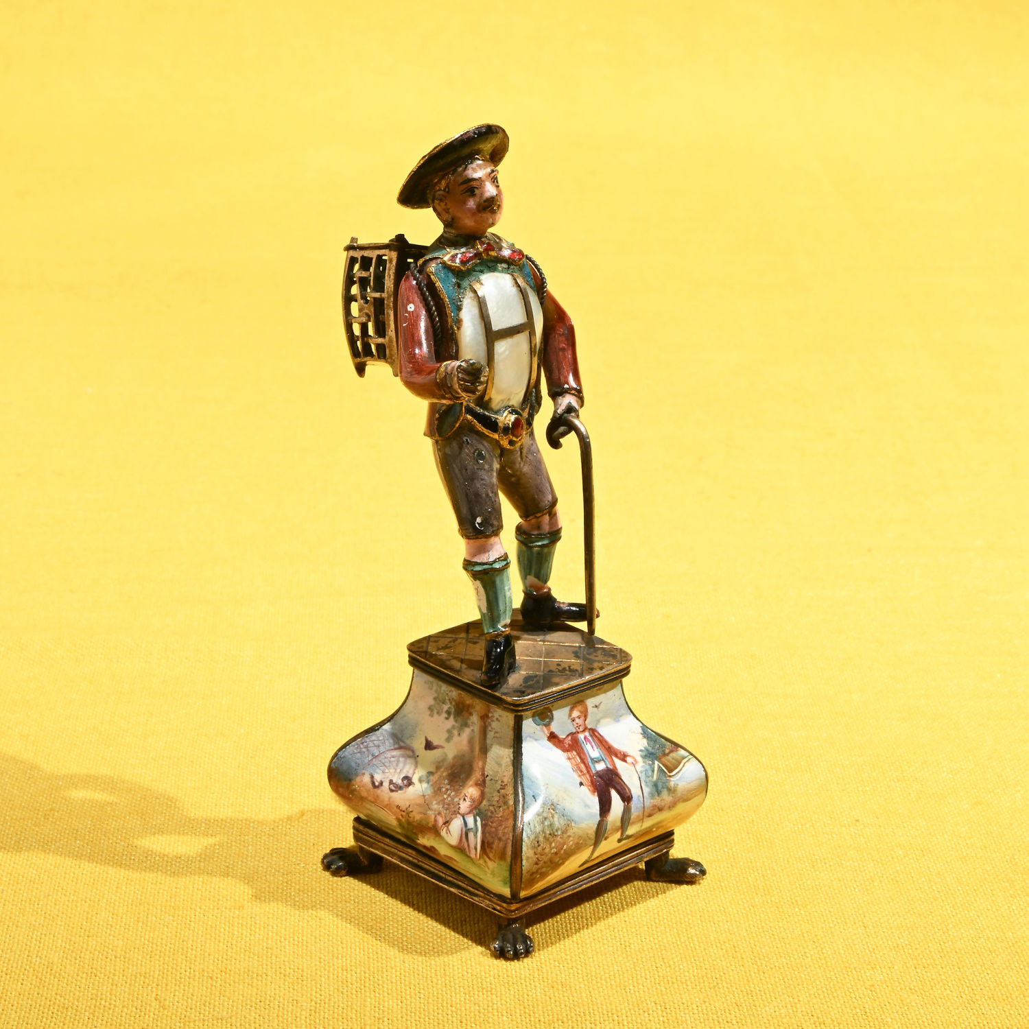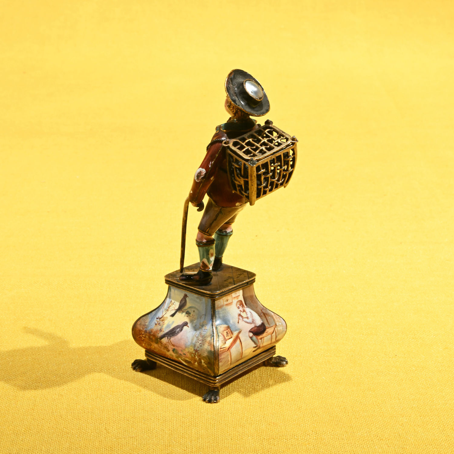 Posta su un basamento decorato con scene con uccelli, l’uomo è rappresentato come un venditore di uccelli. Dimensioni complessive 11x4x4,5 cm.